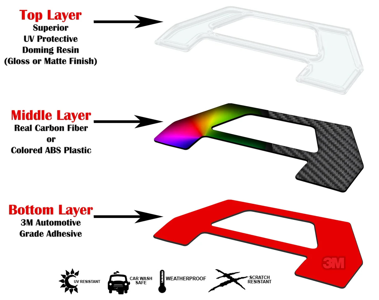 2ND LAYER - Consists of a variety of substrates including our 100% Real Carbon Fiber, Chrome, Camouflage and Factory color matches to allow an array of custom options.