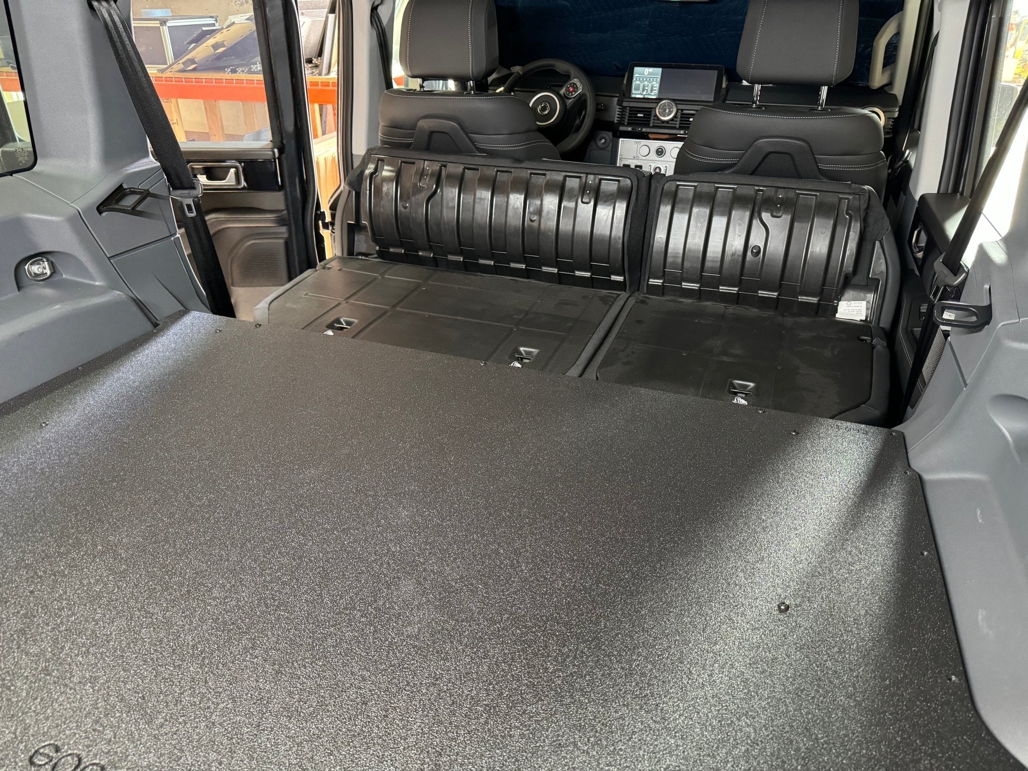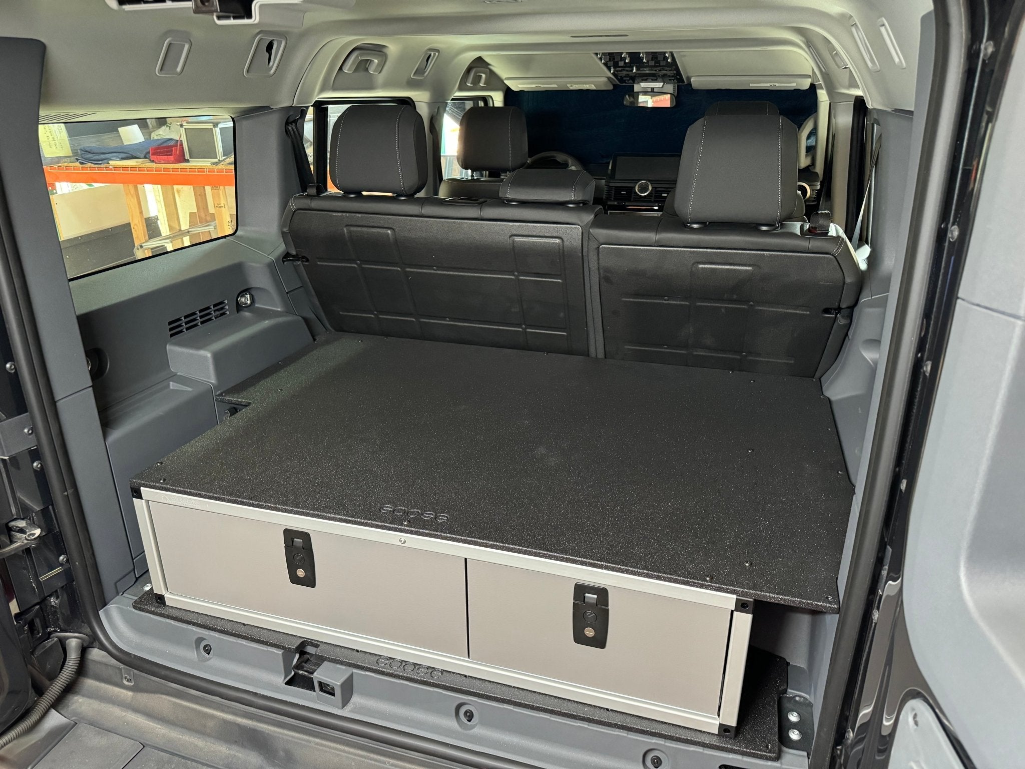 Este cajón de lado a lado cuenta con una placa superior revestida para una mayor durabilidad, así como un lugar para montar elementos adicionales, como anclajes para correas de refrigeradores y enfriadores, etc. La placa superior es más ancha que el módulo y tiene alas que se extienden más allá de los lados del módulo del cajón para seguir los contornos del interior del vehículo. Esto crea una superficie plana que va de pared a pared, desde el respaldo del asiento hasta la puerta trasera.