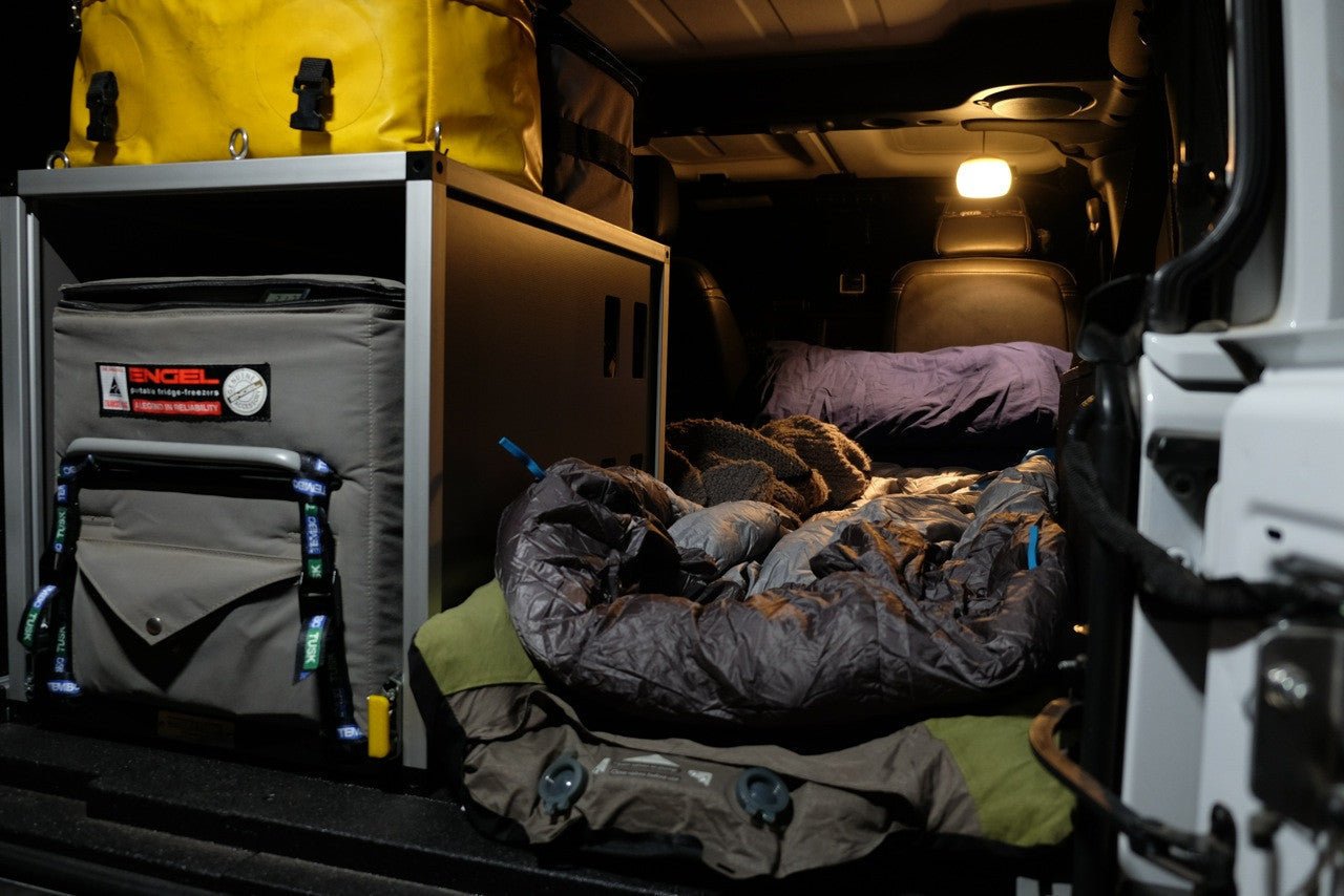 Se requiere el sistema de placa JKU del Jeep Wrangler para instalar el sistema de placa de eliminación del asiento. Las plataformas para dormir JKU se conectan al sistema de placas trasero y continúan hacia adelante hasta justo detrás de los asientos de la primera fila.