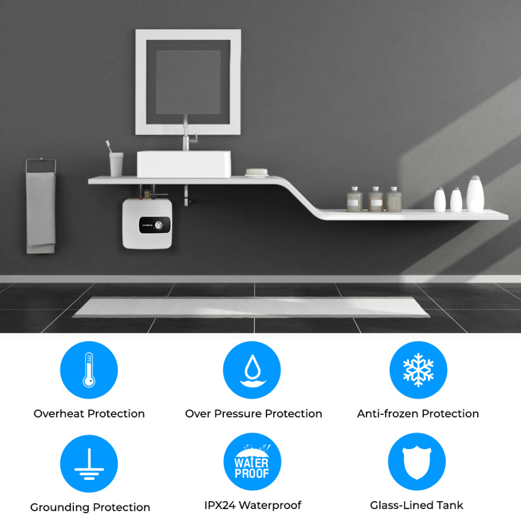 - OVERHEAT PROTECTION - When the water temperature of the under sink water heater exceeds 203°F, the electric hot water heater will automatically shut down. Protect the safety of you and your family