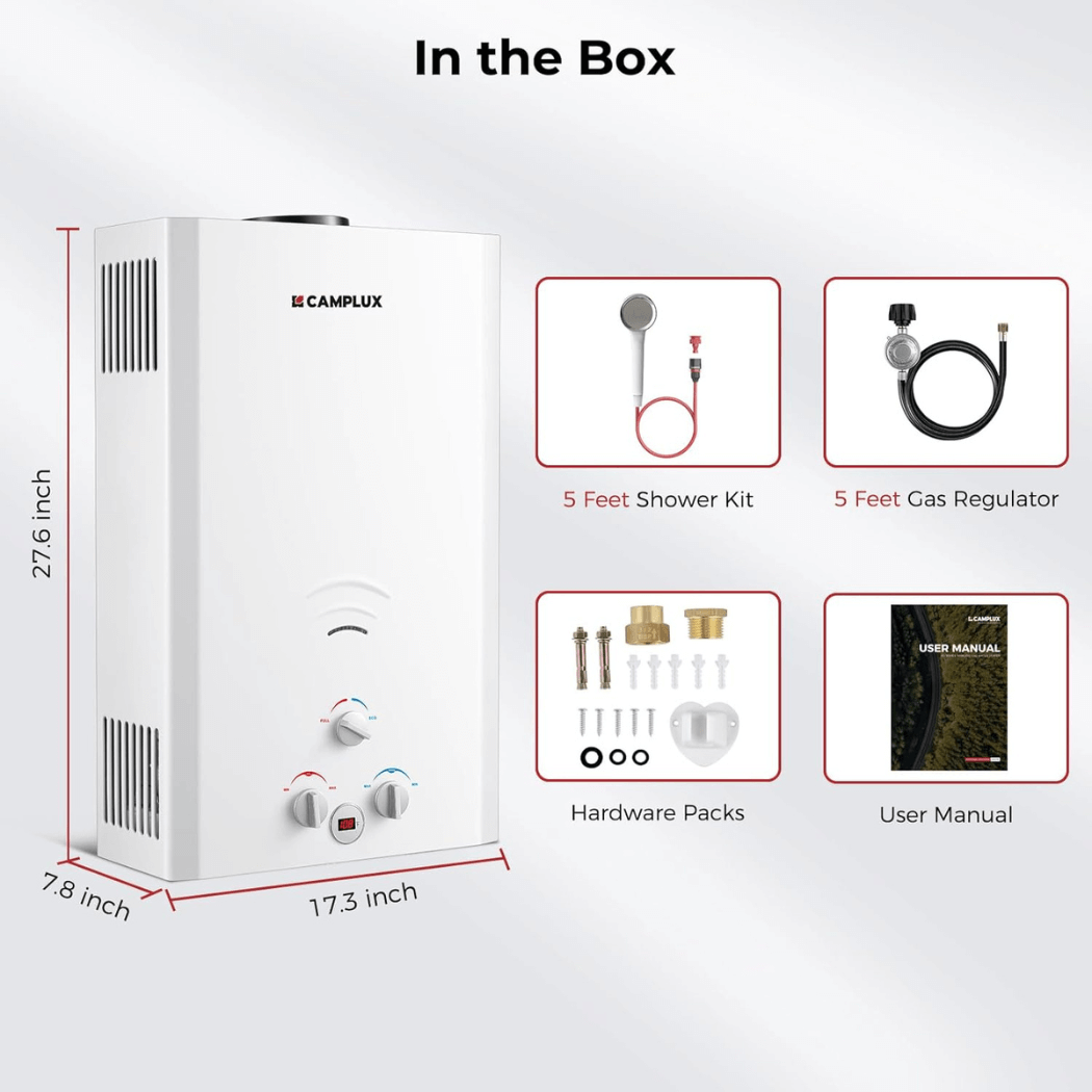 - What's Included - Camplux 20L Tankless Water Heater, CSA certified gas regulator and hose, 5 feet shower kit, hardware packs, garden hose adapters, and instruction manual