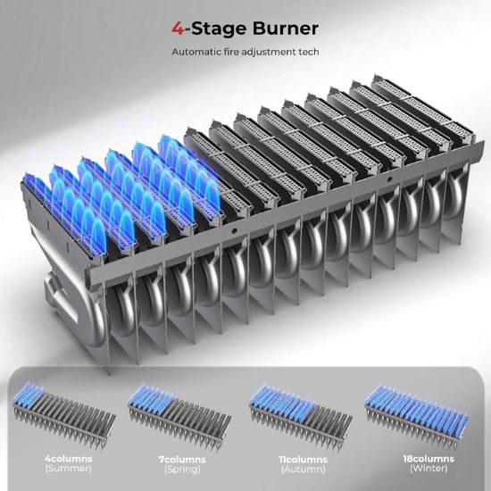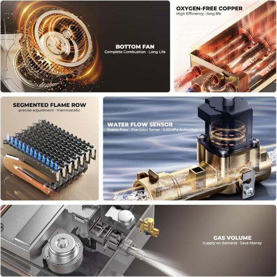 - Low Nitrogen Combustion,Energy Saving. The tankless gas water heater comes with low nitrogen balanced combustion design, v-type stainless steel burner,high heating efficiency up to 89.98 %. The water heater uniform energy efficiency range 0.89-0.92.