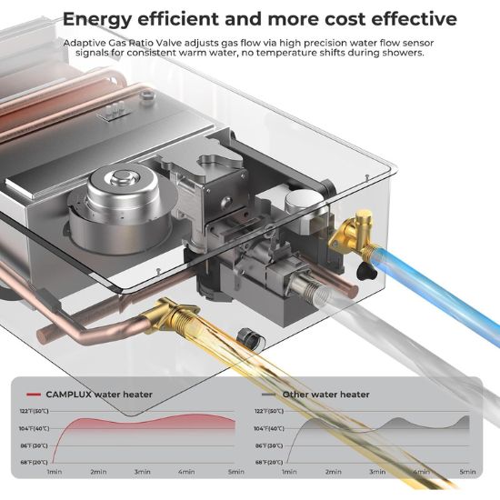 - 3 Simultaneous Applications In Winter.Camplux advanced 6.86 GPM high capacity flow control propane gas tankless water heater delivers 6.86 gallons per minute of on-demand endless hot water ensures instant hot water for 3-4 persons whole home shower and kitchen at one time.