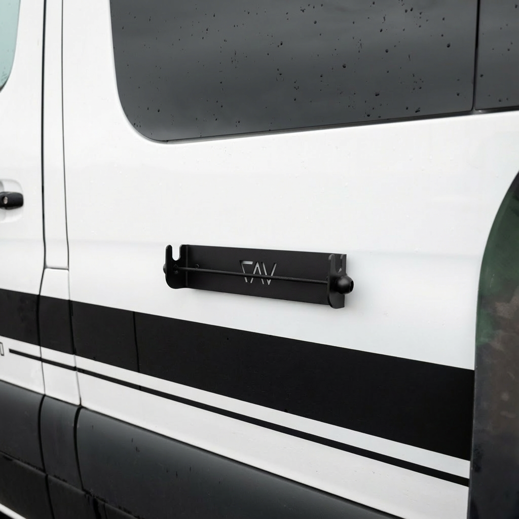 A reposition-able magnetic mount that secures skis or a snowboard to the outside of your van. The metal base uses strong rare-earth magnets to hold to ferrous (magnetic) metal panels while an adjustable bungee keeps your gear snug during travel. Move the mount to different panels as needed and remove it when not in use.