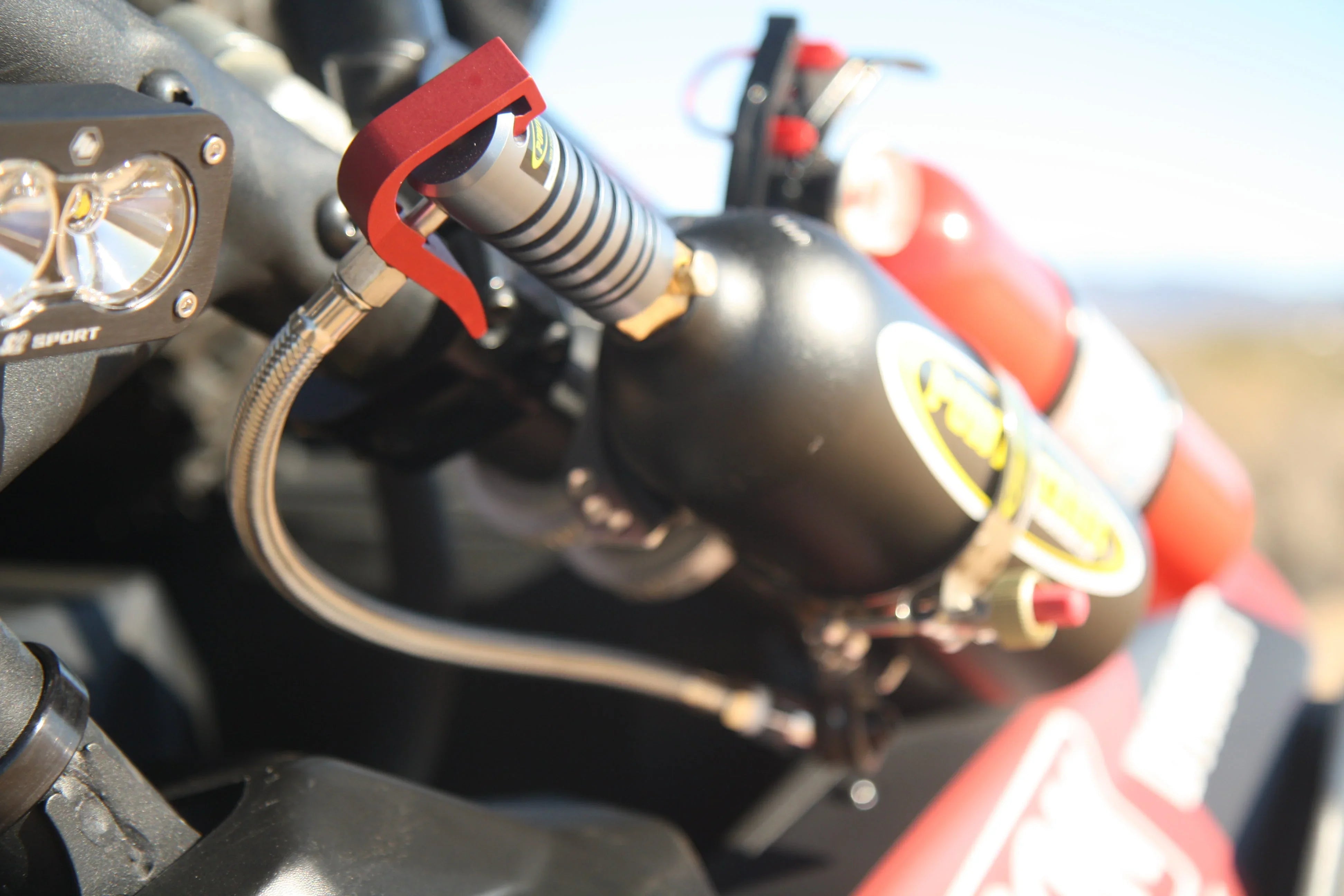If you get a tire puncture on the trail, use the included tire repair kit to plug the hole, hold the air chuck on your tire valve stem, and squeeze the trigger. It's that simple. The trigger is easy enough to use with two fingers, yet stout enough to resist accidental presses. Reseating a tire bead is just as easy. Remove the valve core, hold the air chuck, and squeeze the trigger. You'll hear the satisfying "POP" of a reseat in seconds. Finish airing up and get back on the trail. The bracket in this kit has been proven in the Baja 1000 and King of the Hammers. If you need extra air, consider adding a spare bottle that you can store in a pouch in your glove box or take a look at our Twins (PTM-0220) and Double Barrel (PTM-0210) mounting packages.