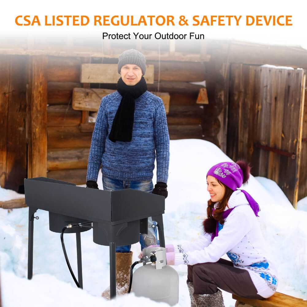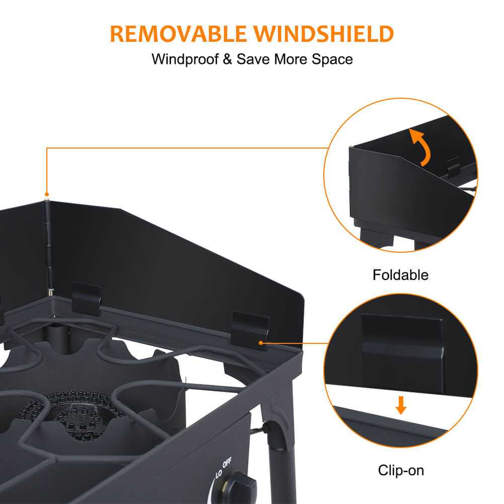 - Multifunctional Outdoor Propane Burner - With detachable legs and 3 foldable and detachable wind deflectors, easy to carry. Very suitable for outdoor use. Such as hunting shutters, deer racks, camping, RV, fishing, hunting camps, tailgates, terraces, sporting events, beaches, beer brewing, canning, and clam baking