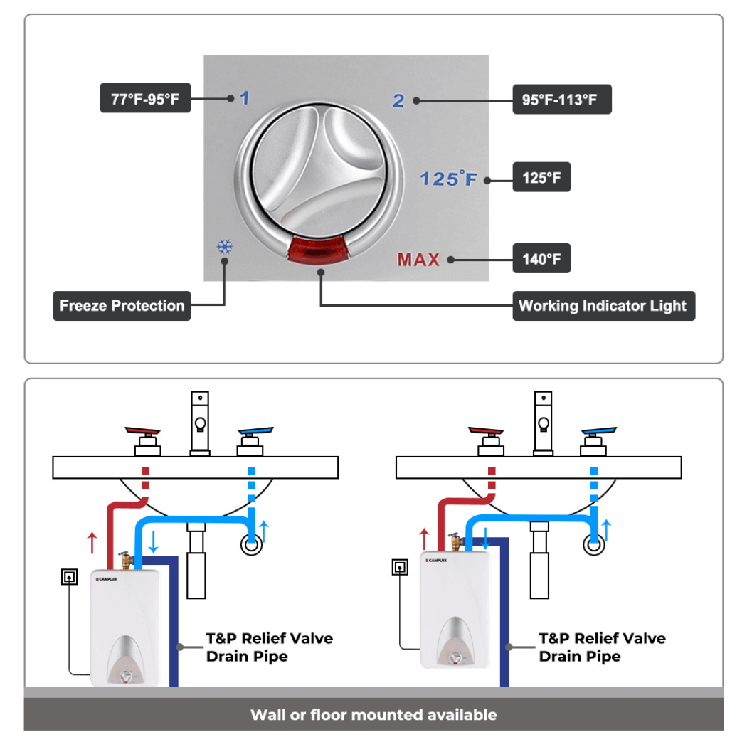 - High Quality Built & Elegant Design- Camplux electric water heater has glass-lined tank for long service life and easy to maintain. Elegant streamline design cover, made your kitchen more pretty.