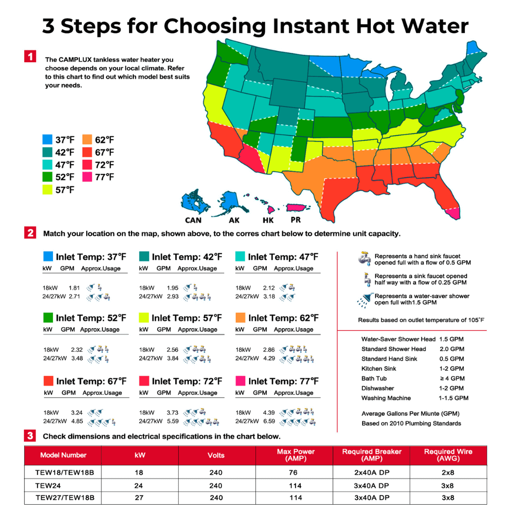 【Important Tips】Ensure the minimum water flow for activation just need 0.66 GPM; Output water temperature is between 80℉& 140℉; Wire gauge 2 x 8AWG; Unit size 17.12" x 13.12" x 3.12"; Water connection 3/4" NPT