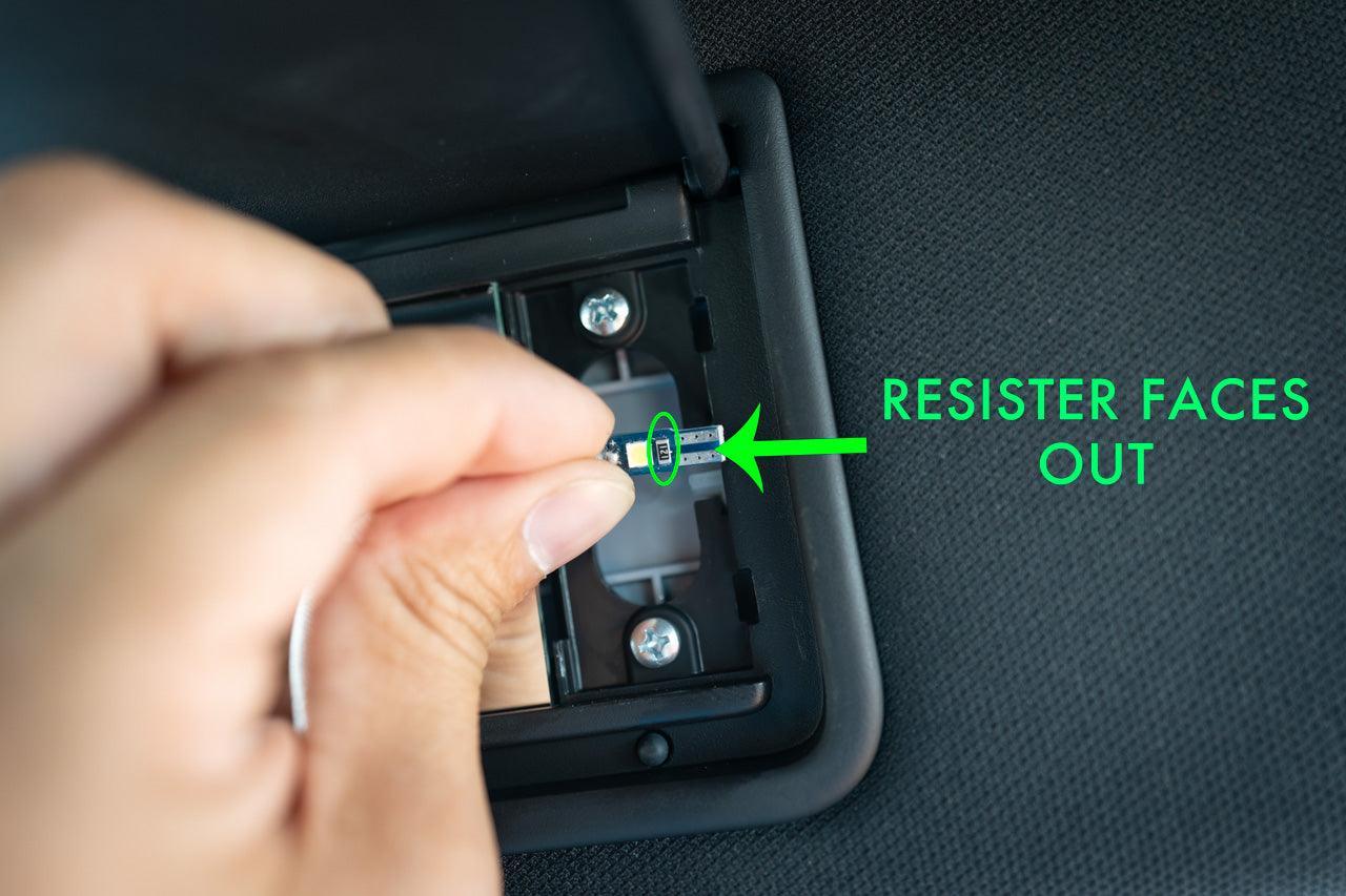 The outer portion of the white cover can be pulled up with your fingers (side opposite the side touching the mirror). Use a small screwdriver and carefully push out the OEM bulb. Replace with our bulb and make sure the resistor faces out. Check out our photos in the main slideshow.Multicolumna
