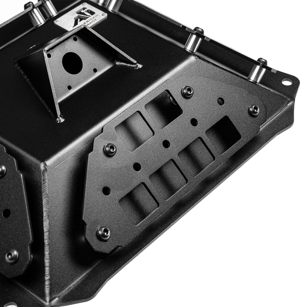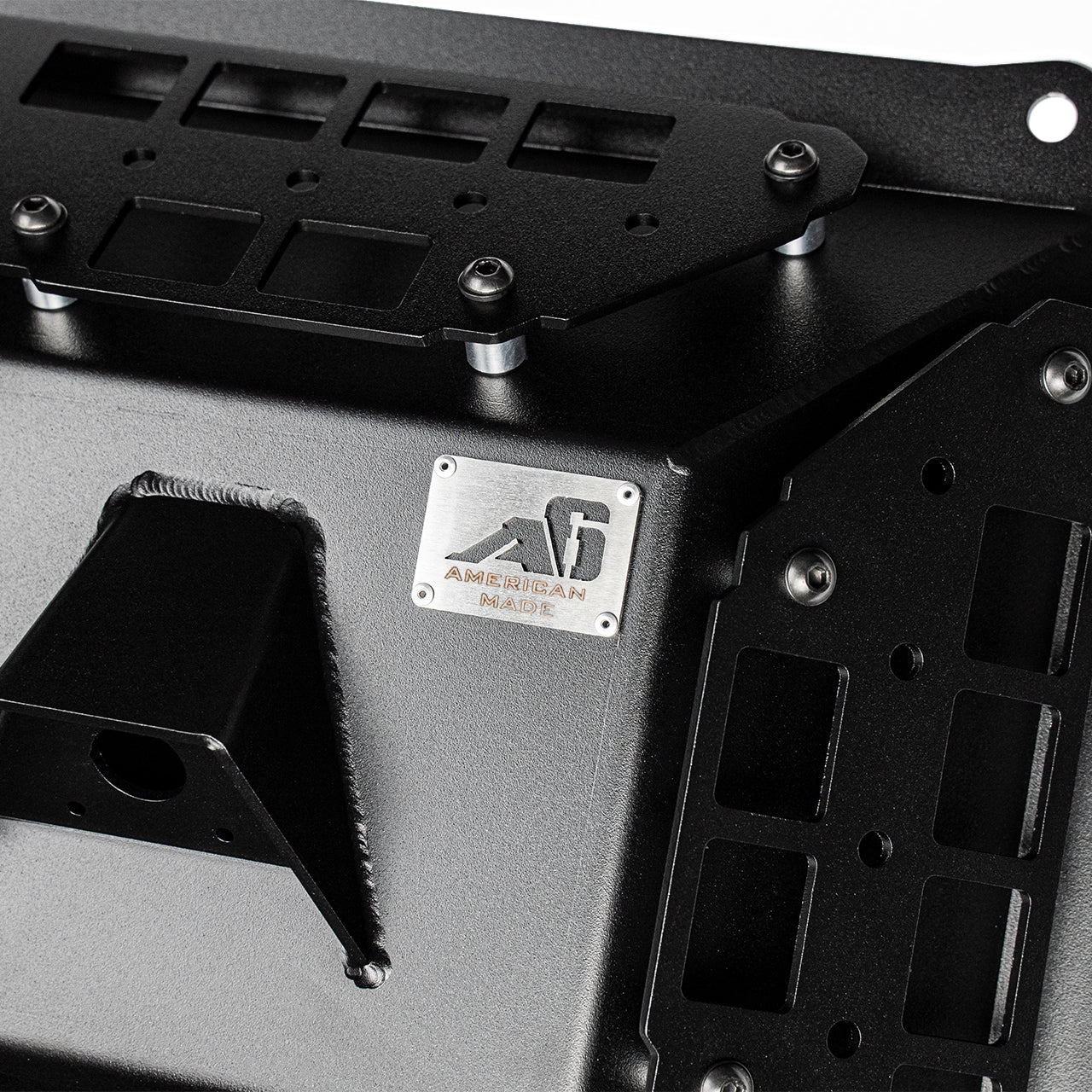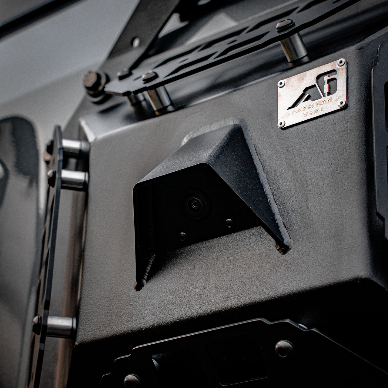 MOLLE pattern cutouts allow for mounting a range of camping and off-road accessories, securely strapped directly to the panel.  Easy to install, bolts into factory locations utilizing machined aluminum adapters. The integrated camera and brake light mounts allow you to keep your factory back-up camera and brake light.