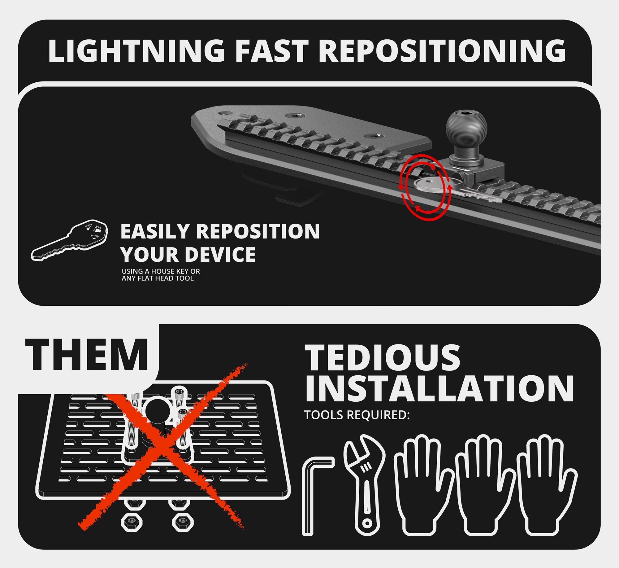 Our design brings the track closer to both the driver and the passenger. This positioning lets you use arms as short as 2 inches, ensuring your phone is within easy reach. Moreover, it preserves the sleek look of your rig.